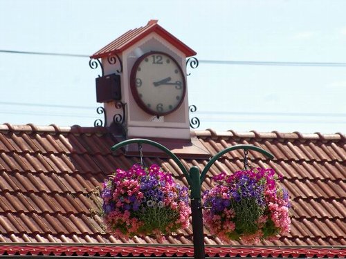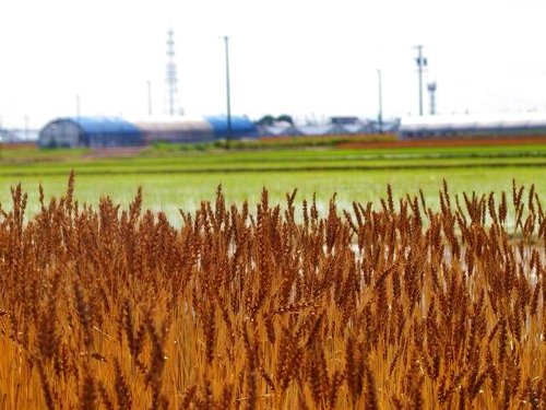 | デンパークの周りは一面麦畑(5月終わり頃は一部稲の田植えが始まっています。) | デンパークではハンギングフラワーがあちこちに飾られています。 | いろんなお花の孔雀のトピアリーがお出迎えです。 | ||||||||||||||